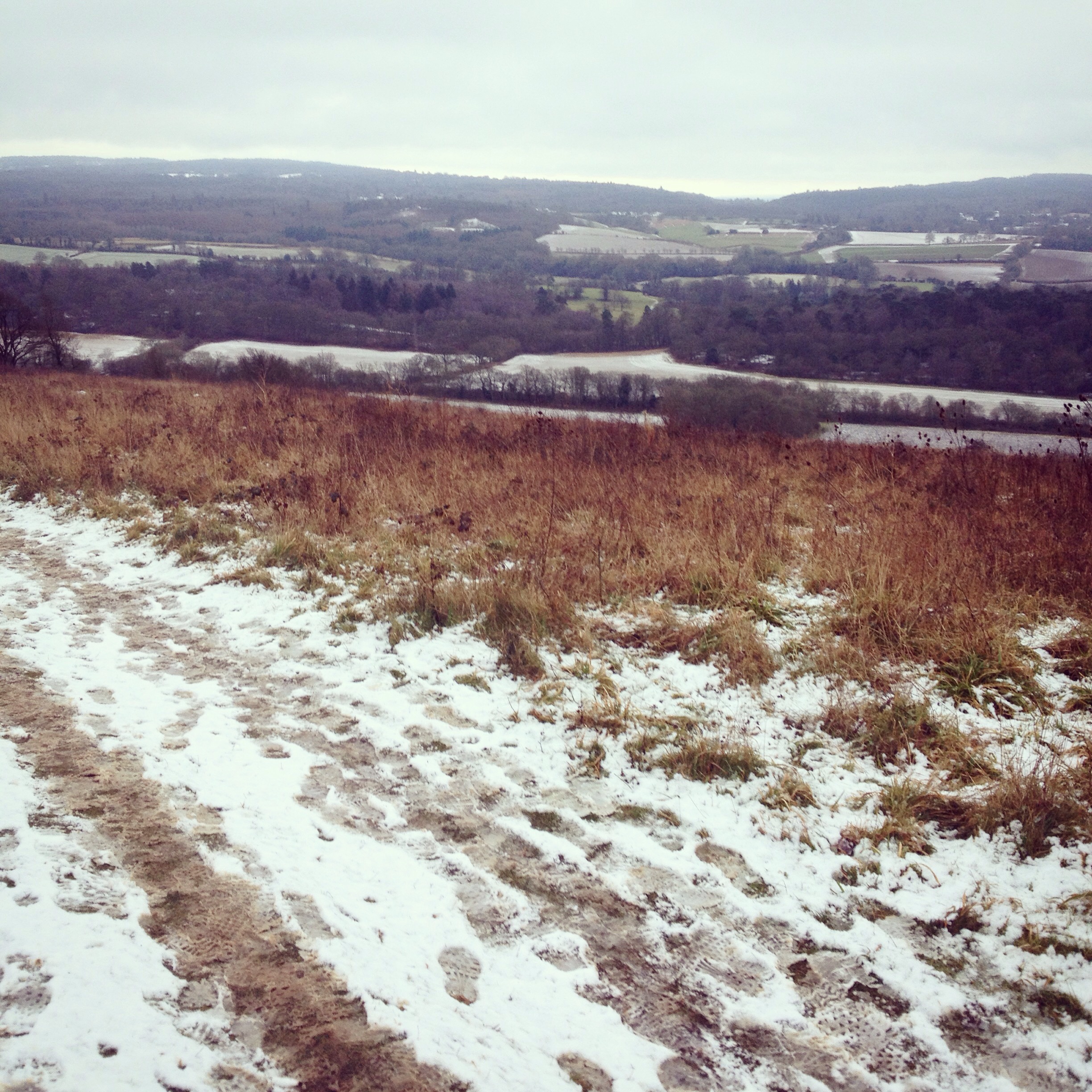 But once you reach the top, all there is to do is go back down again. At least, figuratively and literally, going downhill is what it felt like. My Garmin disagrees; according to him we had another fair old climb, not to mention 11 more miles to run, but I have absolutely no recollection of this. At some point there would have been the old faithful downhill at Denbies wine estate – a particular favourite spot, can’t imagine why – looking out over glorious acres of vines all dusted with snow like icing sugar on a Yule log. Despite my hazy memory I remember that image vividly, and I remember thinking that I should take a photo and then deciding not to stop and lose momentum, and that the mental image was strong enough I’d never need a photo to remember it. Flawless logic for an exhausted, frozen, mileage-addled brain.