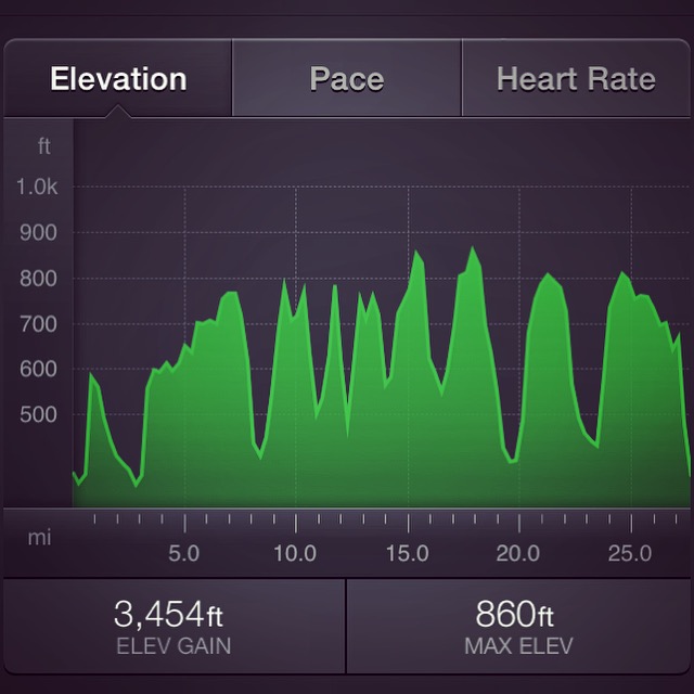 Worryingly, that’s lightly slower than I’d planned at this point even taking that one climb into account – I’ve only just got to the end of the “easy” half, and now I’ve got that and another mile to go, mostly uphill? This isn’t good. I mean I’ve taken it plenty easy and I’m still well within pace, but once I take exhaustion into account I’m going to go downhill fast. Wait, that’s the wrong phrase entirely. Uphill, slow. OK, don’t worry about that now. Already I was mentally comparing the image of the elevation profile with my experience and finding that it wasn’t as gruelling as I’d expected. Physically tough, certainly, but the sort of challenge I was really enjoying getting my teeth into. So I’d obviously got my calculations wrong – it was a 4.5 mile/5.5 mile split, not the other way around, and I’d need to pace the second half accordingly. Never mind, keep plugging on.
